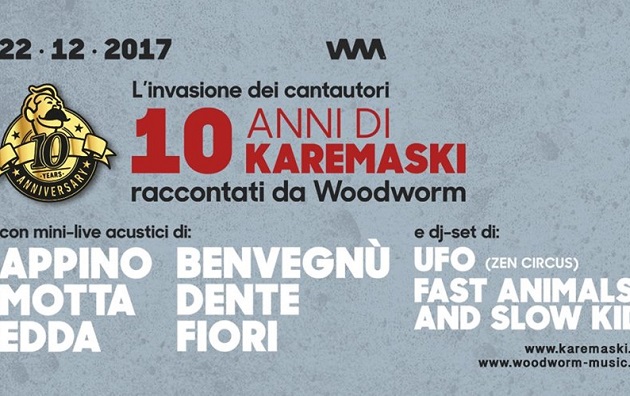 Il 22 dicembre il Karemaski Multi Lab di Arezzo festeggia dieci anni di attività con un evento straordinario, al quale prenderanno parte, con dei mini-live acustici e dj set, alcuni dei più celebrati cantautori della scena indipendente italiani pubblicati da Woodworm nel corso degli anni, come Andrea Appino (The Zen Circus), Motta, Edda, Paolo Benvegnù, Dente, Alessandro Fiori, ma non solo. Il programma della serata: