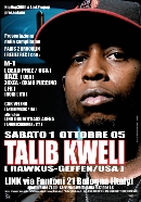 Da Brooklyn, già supporter dei BEASTIE BOYS, un nome che provoca più di un sussulto a chi è addentro al mondo hip-hop, ovvero mister Talib Kweli. Legato fin dagli esordi alla celeberrima Rawkus Records, nel 1998 produce con Mos Def, sotto il nome di Black Star, il suo primo album che sarà considerato il migliore progetto di quell’anno. Gli ha fatto seguito un altro disco in duo - stavolta con il dj Hi-Tek - l'ottimo "Reflection Eternal". Il suo primo album da solista, Quality, è risalente al 2002. Ma è il secondo, "The Beautiful Struggle" uscito un anno fa, quello con cui Talib Kweli cerca di sparare sé stesso nello spazio siderale, visto che tra i produttori spiccano i NEPTUNES, i re mida dell’hip hop da classifica e non solo, e Kanye West, che è arrivato ai Grammy con dieci dico dieci candidature per qualunque categoria tra cui miglior emergente, miglior canzone e miglior disco. Ultima collaborazione in ordine di tempo vede Talib presente nell'ultimo album di Guru. Quindi diciamo che questo ragazzo di Brooklyn figlio di due insegnanti e appassionato di scrittura dai tempi del liceo, ha le carte in regola per essere nello stesso ruolo del suo produttore ai Grammy successivi. Talib arriva ora in Italia - al Link di Bologna - in una serata in cui sarà presentata la xompilation "Paris2Brooklyn" su Relief Records, e che vedrà alternarsi sul palco, prima di Qweli, M1 (Dead Prez/USA), Raze (USA), Zoxea-Oxmo Pucino (FR), Inoki (Relief Records/Ita), e i nostrani Cor Veleno(Antibe Music/ Ita).