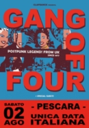 Dopo quasi trent’anni, a Pescara nella loro unica data europea oltre a quella di Londra, arrivano in Italia i Gang Of Four: la band porterà in tour il meglio del proprio repertorio ed un assaggio del nuovo album “Second Life”. Considerati tra i protagonisti della scena post punk e vicini a gruppi come Stranglers, The Fall e Clash, i Gang Of Four sono una post punk band fortemente influenzata da funk e dub reggae. Definiti i padrini della scena crossover e di un certo modo di fare punk, i Gang Of Four hanno ispirato i primi Red Hot Chili Peppers, il crossover dei Rage Against The Machine e il post hardcore americano di Minutemen e Husker Du.