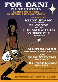 Gli artisti, dei quali segue una breve presentazione, sono tutti esponenti di qualità della scena musicale britannica ed italiana. Ognuno di loro aveva un rapporto speciale d’amicizia con Daniela, con la quale condividevano un’autentica e sincera passione per la musica. Questi ragazzi amavano Daniela e ne apprezzavano la dolcezza, la simpatia, la genuinità e gli innumerevoli talenti. Questa manifestazione è per loro l’occasione di ricordare con affetto la loro amica, attraverso la cosa che Daniela amava di più, la musica. Kling Klang I Kling Klang sono un quintetto originario di Liverpool che incide per la lRock Action Records, label degli scozzesi Mogwai. Lo stile del gruppo si colloca al crocevia tra diversi generi, ivi compresi l’elettronica, il kraut-rock e il progressive rock di matrice nostrana, con più di qualche strizzatina d’occhio alla produzione del Maestro Morricone. Il risultato è una coinvolgente miscela di sonorità sideree e spaziali, dalla precisione matematica, ma dall’impatto emotivo incredibile. La band, una delle più convincenti del panorama britannico, propone degli spettacoli live a cavallo tra concerto, performance ed installazione artistica. El Goodo Gli El Goodo sono la dimostrazione di quanto si possa guardare con creatività al passato, senza cadere nell’imitazione più becera, ma traendone viva ispirazione. Il gruppo si forma in Galles all’inizio del Millennio e viene immediatamente reclutato dall’etichetta dei Super Furry Animals, condividendo con essi una generale visione della musica leggera come forma d’arte legittima, scevra da ogni obiettivo mercantilistico. La band esordisce nel 2005 con l’ottimo album omonimo, graziosa combinazione di pop e neo-psichedelia, che trova la sua forza in melodie accattivanti ed intriganti. Il 2008 vedrà la pubblicazione dell’atteso secondo lavoro, che verrà presentato in esclusiva durante la manifestazione dedicata a Daniela. Yuppie Flu Veterani dell’indie rock italico, gli Yuppie Flu, formazione anconetana declinano in maniera del tutto originale ed apprezzabilissima il genere, senza sfigurare minimamente al paragone con i padri ed ispiratori d’oltre oceano. I membri del gruppo erano amici personali di Dani e lei sarebbe sicuramente grata del loro piccolo tributo. The Narcotics Questa complesso italiano ha le sue radici in quel di Bologna e rappresenta uno dei nuovi ensemble più rappresentativi della scena garage, stile che Dani amava molto e al quale si era recentemente nuovamente appassionata. Martin Carr Forza creativa del fenomeno Brit Pop Boo Radleys e mente del progetto Brave Captain, Martin Carr incarnava per Dani un vero e proprio modello estetico, un “genio”, come lo ha lei stessa definito, capace di dar vita a irresistibili e delicatissime gemme pop. Martin Carr si esibirà in pezzi dei Boo Radleys per la prima volta da cinque anni a questa parte. Huw Stephens Giornalista e anchor man per le stazioni BBC1 e BBC Wales, Huw affianca all’attività radiofonica quella di disc jokey ufficiale nei più rinomati festival rock britannici, come Reading e Glastonbury. Huw si è reso disponibile come presentatore dell’intero avvenimento.