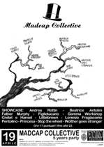 Sarà un po' come una festa delle medie, con tutti i gruppi del Collettivo che si esibiranno in brevi showcase di 15 minuti l'uno (vedi sotto la scaletta), con la proiezione di tutti i videoclip usciti in questi cinque anni, e con qualche anteprima...Il tutto accompagnato da patatine, arachidi, pane, formaggio, salumi, bibite, bibite analcoliche etc.. Sarà anche l'occasione per presentare ufficialmente le prossime uscite, ovvero “The preacher” di Stop the Wheel, che uscirà per Stout Music in collaborazione con Madcap, e l'esordio di Gretel & Hansel, 'Follow the porcupine'. Ma dato che da queste parti si continua a credere sempre e solo nel TRE, ecco che sarà finalmente disponibile una Compilation in cui tutti i gruppi/progetti Madcap hanno coverizzato un altro gruppo/progetto Madcap, con gli abbinamenti affidati ad una democraticissima estrazione: una Madcap suona Madcap che vuole essere il primo regalo da ricevere in questa festa di compleanno. La compilation sarà venduta al prezzo simbolico di TRE euro, e sarà a brevissimo scaricabile dal sito del Collettivo. Ecco qui gli abbinamenti: 1. My dear killer covers Wolther goes stranger 2. Pentolino -> Bob corn 3. Lorenzo Fragiacomo -> Stop the wheel 4. Stop the wheel -> Gomma Workshop 5. Gomma workshop -> Pentolino 6. Littlebrown -> Beatrice Antolini 7. Blake/e/e/e (ex Franklin Delano) -> Princesa 8. Princesa -> Father Murphy 9. Gretel e Hansel -> My dear Killer 10. Wolther goes stranger -> Franklin Delano 11. Father Murphy -> Littlebrown 12. Bob Corn -> Gretel e Hensel 13. Beatrice Antolini -> Andrea Rottin 14. Andrea Rottin -> Lorenzo Fragiacomo
