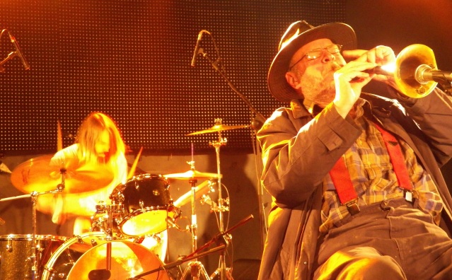 Entra sul palco appoggiandosi ad un bastone David Thomas, unico membro originale e principale “songwriter” dei Pere Ubu, la band che ormai 40 anni fa sconvolse tutto il panorama punk e new wave della scena musicale americana. E’ decisamente più stanco e le sue condizioni di salute sembrano decisamente peggiorate rispetto all’ultima volta che avevamo visto il suo gruppo esibirsi dal vivo, nel Maggio del 2007 a Roma, al Circolo degli Artisti. Si appoggia su una sedia ed impugna una chitarra elettrica che da lì a poco strofinerà come si deve. David è molto attento a posizionare accanto a sé, e con estrema cura, una bottiglia di vino rosso di qualità dubbia acquistata nel primo supermercato trovato aperto e quasi controvoglia, con gli occhi ancora semichiusi, inizia il suo show. Legge da uno spartito i suoi testi, sembra un “reading” di quelli di fine anni Sessanta dei poeti della “beat generation”, ma è qualcosa di più: è la “Moon Unit” dei Pere Ubu, una lunga “suite” di circa trenta minuti che diventa il reame dell’improvvisazione, della sperimentazione più cupa, della “dark wave” più folle che orecchio umano possa ancora ascoltare. Quando comincia a cantare, oppure quando recita il suo “spoken word”, David Thomas si dimostra infinitamente più lucido di quanto avevamo temuto. La sua voce, ora disperata, ora cinica e tagliente, è lo strumento attraverso il quale passano storie di disillusione, di allucinazioni, di visioni e di morte «Don’t cry when you see me go» invoca Mr Thomas, mentre il resto della band è impegnato in un crescendo incredibile, che mescola noise rock, elettronica, free jazz, punk rock e musica di avanguardia senza badare a etichette, categorie o generi musicali. E’ quanto di più vicino possiate immaginare ad un “brainstorming” tradotto in musica, è l’elegia dell’ultimo sopravvissuto di una stagione punk iconoclasta e ribelle che lui iniziò con i Rocket From The Tombs nel lontano 1975, a Cleveland, in Ohio. Echi Stooges, energia pura, rabbia incontenibile, con musicisti che finirono poi nei Dead Boys o, per l’appunto, nei Pere Ubu. Adesso con lui sul palco, ci sono altri musicisti, quelli che da dieci anni a questa parte, hanno aggiornato l’ultima versione delle grida dei Pere Ubu verso il mondo moderno: Keith Moulinè alla chitarra elettrica, Gagarin all’elettronica, Robert Wheeler ai computer, Darryl Boon al clarinetto, e Steve Mehlman alla batteria.