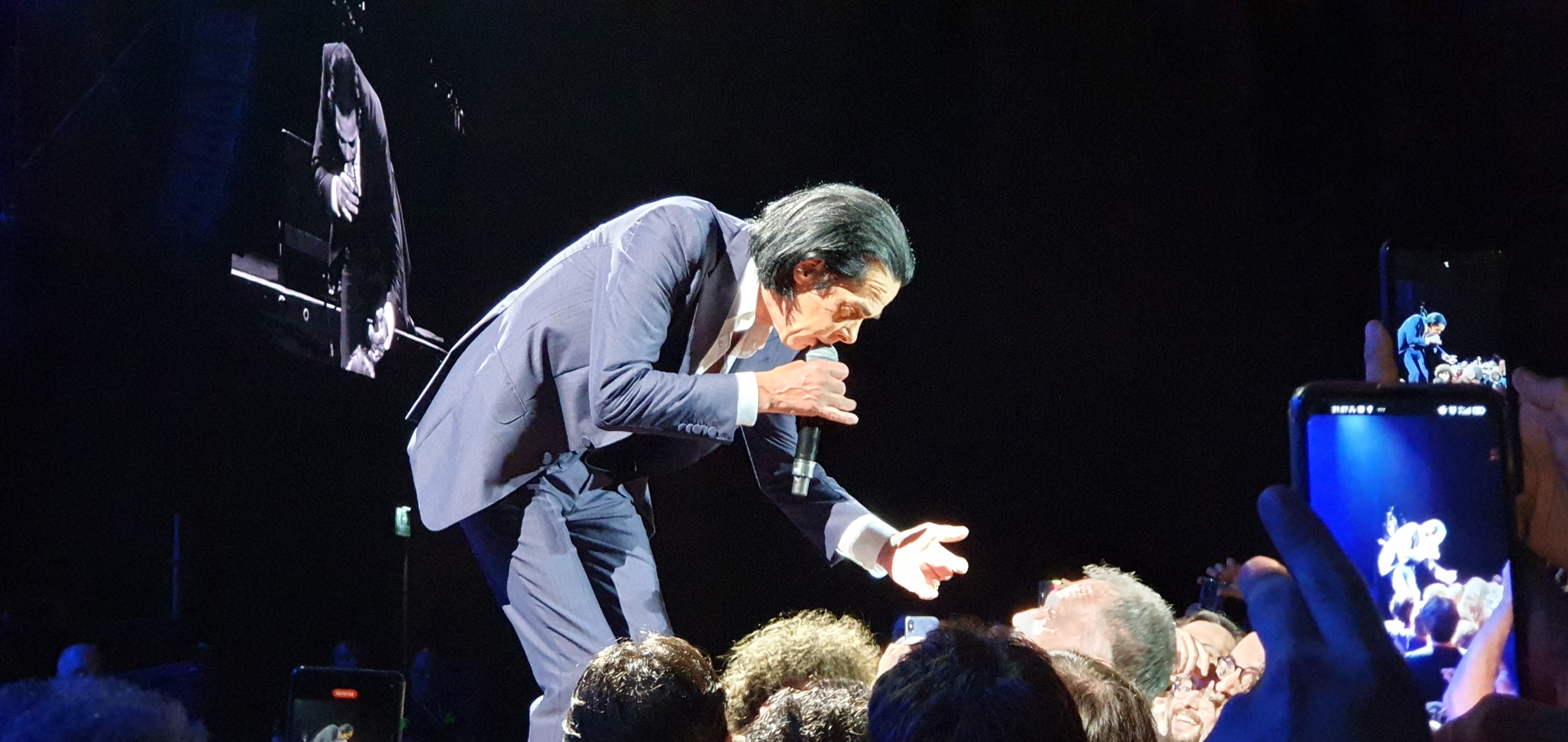Dopo tanta energia Nick Cave si siede al piano intonando I Need You che esegue da solo e che dedica al figlio dicendo “He should be here, maybe he's here” (lui dovrebbe essere qui, forse è qui in questo momento). Finisce quasi in lacrime coprendosi la testa ed il viso con un asciugamano, un momento commovente ed intenso. Dopo un altro paio di brani lenti e d'atmosfera si torna al rock tinto di blues con l'ipnotica Tupelo (da THE FIRST BORN IS DEAD del 1985) con Cave sospeso sul pubblico sorretto dalle braccia della gente. Un caratteristico rintocco di campana suonata con un martello da Jim Sclavunos introduce Red Right Hand dove Nick incita le persone a cantare e poco dopo si arriva a Higgs Boson Blues (tratta dal bellissimo album PUSH THE SKY AWAY – 2013) che raggiunge l'apice col verso “Can You Feel My Heartbeat?” (riesci a sentire il battito del mio cuore?) cantato guardando alcune persone negli occhi ed invitando i presenti a rispondere intonando “Bum Bum Bum”. Delle note di armonica introducono la bella City of Refuge durante la quale i coristi avanzano a fronte palco affiancando Cave.