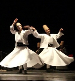 La tradizione dei “dervisci rotanti” è iniziata ottocento anni fa nella Tekke dei Mevlana , a Konia, in Anatolia Centrale, in un convento ora trasformato in museo. Era il centro principale dei mevlevi, monaci mistici legati a Rumi, un poeta di origini afgano -persiane. La “sema” è una danza rituale che ha lo scopo di connettere le tre componenti fondamentali della natura umana: lo spirito, la sfera emotiva e l’anima che è poi la Sema, che è movimento, che significa vita. Il Maestro, Sheik Nail Kesova, 76 anni, guida ancora la cerimonia e detta i tempi sia delle musiche che della danze, in un silenzio interrotto solo dal canto rituale o dall’accompagnamento di strumenti acustici tradizionali come flauti, timpani e cembali.