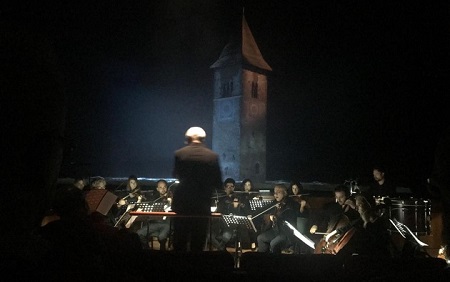 Le partiture musicali sono stata suonate dal vivo dall’Orchestra di Musica Contemporanea del Parco della Musica mentre scorrevano sullo schermo i video realizzati da Armin Ferrari, un supporto visuale alla drammaticità della musica. Una performance della durata di soli cinquanta minuti, ma straordinariamente intensa, una rappresentazione che ci invita a riflettere sul rapporto ambiguo fra Uomo e Natura. Altro tema della rappresentazione teatrale è costituito dall’elogio del Silenzio, racchiuso come è nell’immagine fissa di quel campanile, oggetto immobile, radicato nel mondo, silenzioso e fermo. Lo spettacolo è stato introdotto dall’esecuzione di “Serenade” una composizione del 1978 firmata da Valentin Sylvestrov, musicista ucraino coetaneo di Arvo Pärt, esponente di rilievo della musica meditativa e di quelle atmosfere rarefatte che hanno costituito l’anima dell’intera rappresentazione