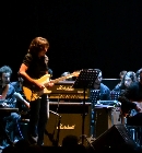 L’orchestra schierata sul palco si compone in realtà di 80 chitarre elettriche, 20 chitarre basso e 1 batteria ed è formata da giovani musicisti, in gran parte allievi migliori delle scuole romane di chitarra come la Frets e la PMCE. Ricordiamo fra gli altri i nomi di Luca Nostro, Luca Costantini, Massimo Colagiovanni e Paolo Ceccarelli, alle chitarre, di Givanni Pallotti al basso e di Peppe Marino, alla batteria. Tonino Battista è stato chiamato a dirigere dal vivo questa orchestra davvero particolare, tutta formata da giovani talenti, alcuni dei quali esponenti di hard rock band locali, come Nicolò De Maria, per esempio, che è il chitarrista dei Ruinthrone. Passaggi armonici che si sviluppano a partire da una sola nota, tipici del minimalismo, si mescolano con l’improvvisazione che è tipica del jazz e disegnano delle partiture ora ascendenti ora discendenti che danno un senso alla dissonanza e al fragore. Certo, la quasi totale mancanza di una linea guida sul piano melodico, procura talvolta momenti di disorientamento fra gli spettatori, ma si tratta pur sempre di una sfida in musica, che mette insieme la chiara matrice hard rock dei musicisti con elementi di musica contemporanea. Si passa quindi dalla semplicità di certi arpeggi a soluzioni più complesse ed è in effetti singolare vedere Stef Burns alle prese con un repertorio così sofisticato, che va oltre gli assolo e le sferzate chitarristiche che lo hanno fin qui reso protagonista. La musica di questa giovane orchestra, per quanto estrema, risulta comunque coinvolgente e certi fraseggi chitarristici riportano alla memoria temi crimsoniani e le “frippertronics” (che segnarono il passaggio di Robert Fripp dai King Crimson all’elettronica), La struttura musicale non è mai troppo rigida e lascia spazio a momenti godibili, dove la musica diventa più fluida e scorrevole. Sul finale poi, dopo circa un’ora e venti minuti di una musica altamente cerebrale, ecco che esplodono liberatorie, catartiche le note di Black In Black degli Ac/Dc, quasi a voler marchiare con il fuoco l’appartenenza al Rock dei giovani chitarristi romani presenti sul palco.