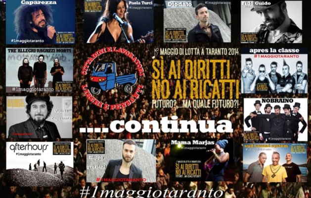 Il Primo Maggio è stato ovunque. Il senso del primo maggio lo si è respirato, per la seconda volta, nel Parco Archeologico delle Mura Greche di Taranto, in un’aria dolceamara. Pubblico quasi triplicato dallo scorso anno, si è arrivati ad oltre 100mila spettatori. Niente sindacati, urla vere e gesta nobili per la festa dei “Cittadini e lavoratori liberi e pensanti” che hanno contribuito con la vendita al pubblico di magliette e vino, all’autofinanziamento dell’evento, e alla campagna per l’acquisto di un emogasometro per l’ospedale “Moscati” di Taranto. Gli artisti si sono esibiti senza cachet. Direttori artistici Roy Paci e Michele Riondino, il giovane Montalbano cresciuto all’ombra dei Tamburi, il quartiere a ridosso dell’Ilva. Padroni di casa, in una conduzione corale, Riondino, la giornalista Valentina Petrini, Luca Barbarossa e Andrea Rivera che non si è risparmiato in apprezzati monologhi.